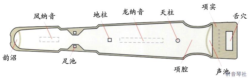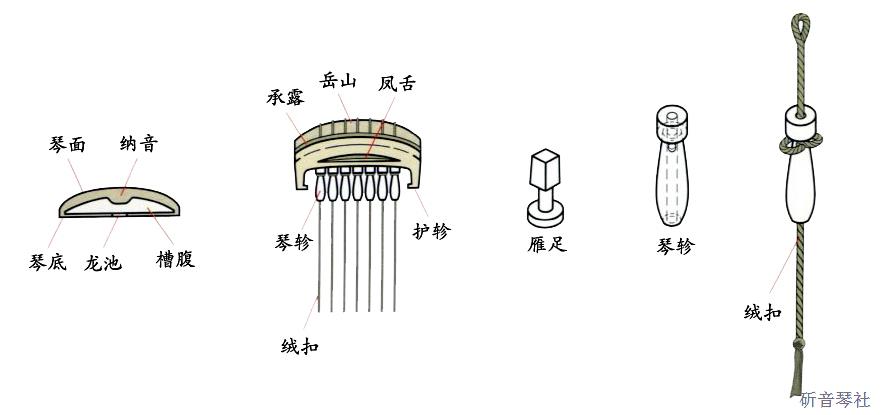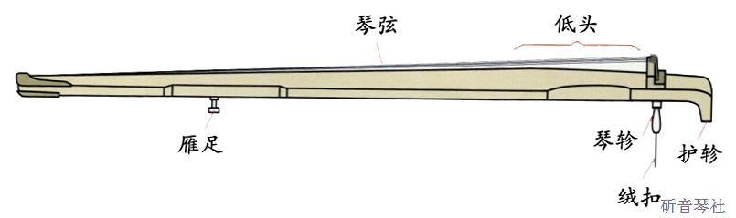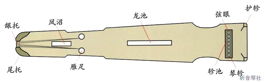 “琴头”上部称为额。额下端镶有用以架弦的硬木,称为“岳山”,又称“临岳”,是琴的最高部分。琴底部有大小两个音槽,位于中部较大的称为“龙池”,位于尾部较小的称为“凤沼”。这叫上山下泽,又有龙有凤,象征天地万象。岳山边靠额一侧镶有一条硬木条,称为“承露”。上有七个“弦眼”,用以穿系琴弦。其下有七个用以调弦的“琴轸”。琴头的侧端,又有“凤眼”和“护轸”。自腰以下,称为“琴尾”。琴尾镶有刻有浅槽的硬木“龙龈”,用以架弦。龙龈两侧的边饰称为“冠角”,又称“焦尾”。
