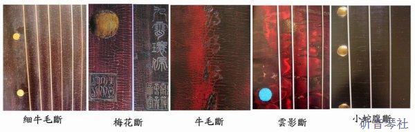 指琴表面上因长年风化和弹奏时的震动所形成的各种断痕。断纹的种类很多,主要有梅花断、牛毛断、蛇腹断、冰纹断、流水断、龙鳞断等。一般来说,琴随年代久远程度不同,断纹也不尽相同,是鉴藏古琴的主要依据之一。目前古琴表面也可以人工仿造出断纹来,主要用火熏烤出来.