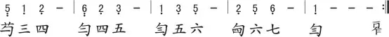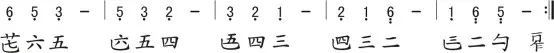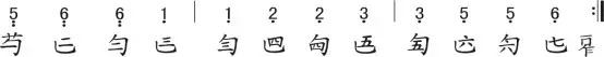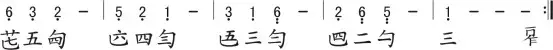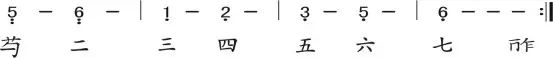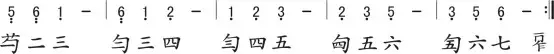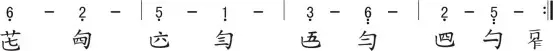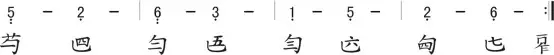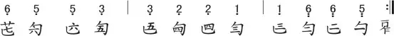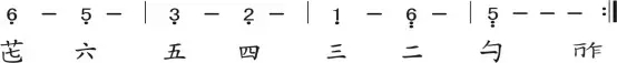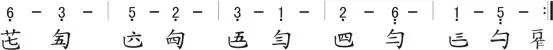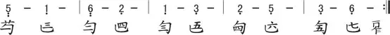 本教程中的乐谱均为双行谱,上面一行是简谱,下面一行是与其对应的减字谱。勾的减字谱写法为“”,里面的数字代表弦数。“”则为散音的意思,也就是弹空弦发出的声音。“”是再作的意思,也就是重弹一遍。古琴减字谱中有一个记谱习惯,如果后一音的指法或音位与前同,那么往往会忽略不计,只记录其弦数。