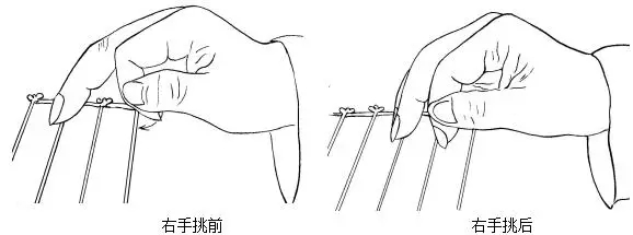 挑与勾一样,也是右手指法中使用最频繁的一种指法,或曰主奏指法。但是挑的方法要比勾稍微难以掌握一点,需要初学者仔细反复的揣摩体会。