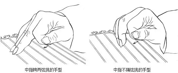 动作要领:先将右手中指置于所挑之弦的外侧弦上(相邻或相隔皆可,但相隔最多不能超过两根弦),作为发力的支点,手腕略沉,稍低于手背;然后将大指第一关节(本文所说的第一或第二关节,是从指尖方向数的)前的指腹部位贴在(不要用力捏)食指第一关切的左侧面,然后大食二指同时收缩,食指前面两个关节都相应曲起,这时指腹紧贴食指侧面的大指则相应曲起第一关节,两指之间与虎口形成一个大致圆形,这时食指的指甲面要在离弦大概一公分左右的后上方,然后大指关节发力伸直推动食指挑出,食指也相应随之发力伸直前两个关节,在离指尖两毫米左右的指甲面上击弦,方向是斜向下45度。击弦后食指停靠在下一弦上放松(见下图),在指甲触弦的那一刻,食指与弦的夹角当在100度左右。