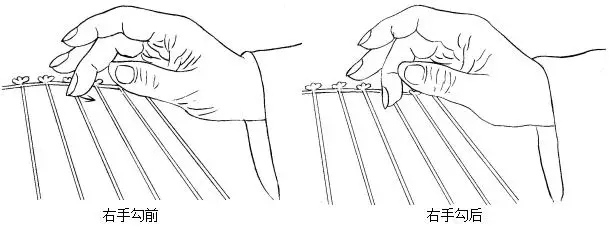 动作要领:先将右手完全放松下垂,然后抬起来平伸(手腕略沉),保持放松手型,将中指的指尖(离指甲约五毫米处)置于任一弦上(位置在岳山与第一徽的中间区域,其它指法皆同),中指与弦呈75度左右的夹角,先将弦压紧,再沿与中指指腹垂直的方向(后下方),用指根关节发力拨弦,拨弦后中指将靠于后一弦上放松。勾时,右手的其它手指应尽量保持放松,中指发力是瞬间的爆发力。具体手型我们来看一下图示: